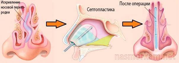 Выравнивание перегородки носа и устранение наростов на ней называется септопластикой. В ходе нее с помощью специальных хирургических инструментов, вводимых через естественные отверстия, удаляются выпирающие части кости и хряща. Как правило, операция занимает не более часа и проводится как под местным, так и под общим наркозом.